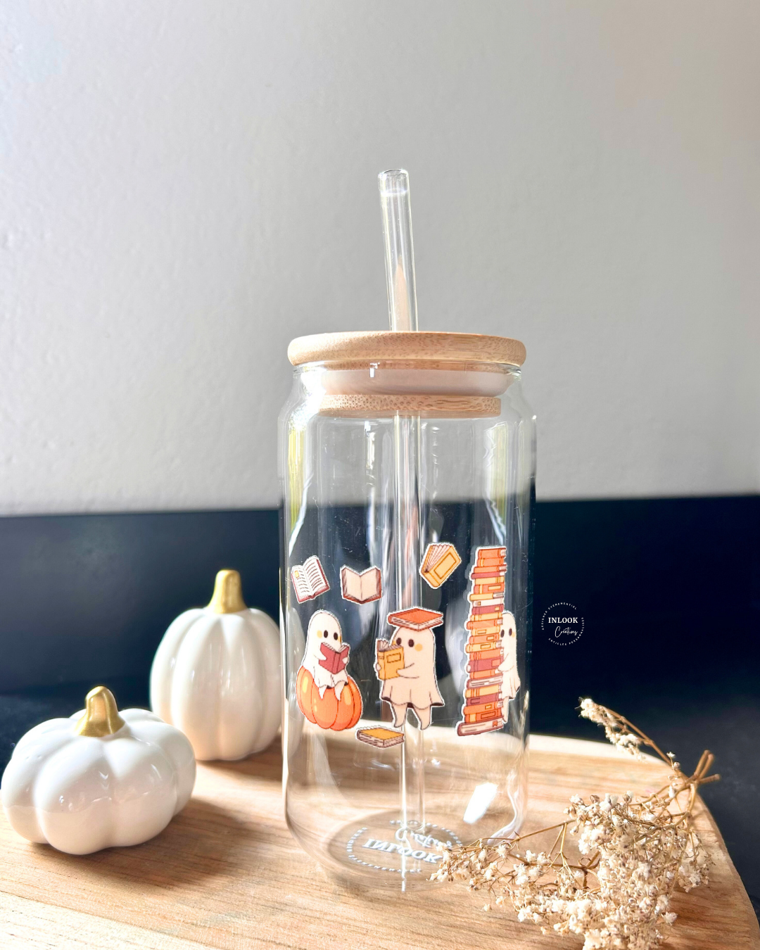 Laissez-vous charmer par notre adorable contenant, parfait pour tous les amoureux de livres et de mignonnerie! Orné de petits fantômes espiègles qui dévorent des livres et construisent des piles de savoir, ce verre est l'accessoire idéal pour vos boissons préférées.