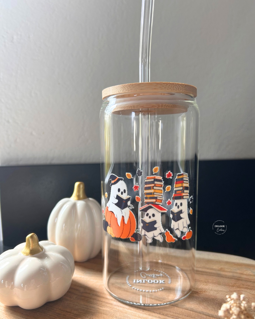 Plongez dans l'ambiance automnale avec notre adorable mug en verre ! Parfait pour les amateurs de lecture et de Halloween. Il arbore un charmant motif de fantômes bibliophiles et de citrouilles.